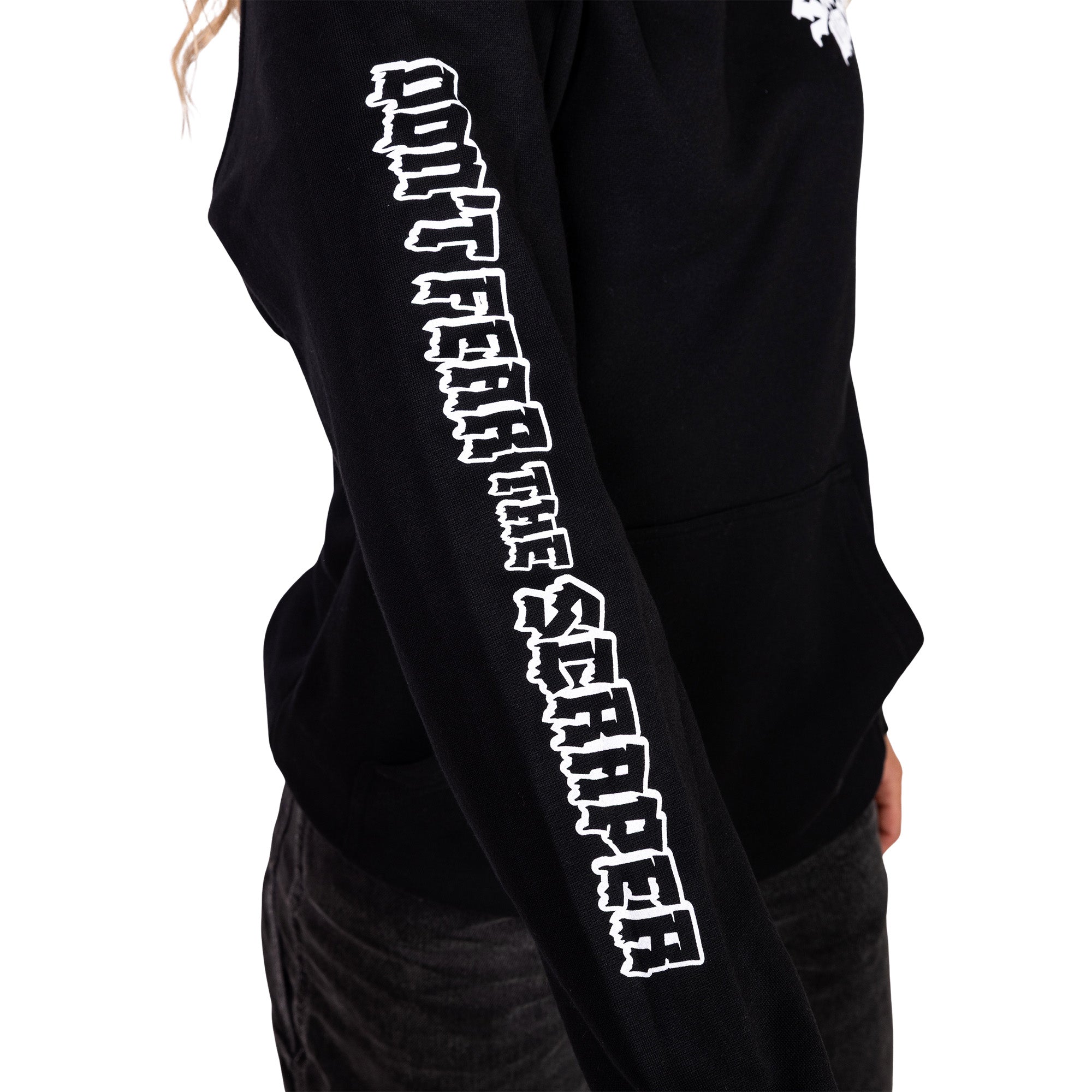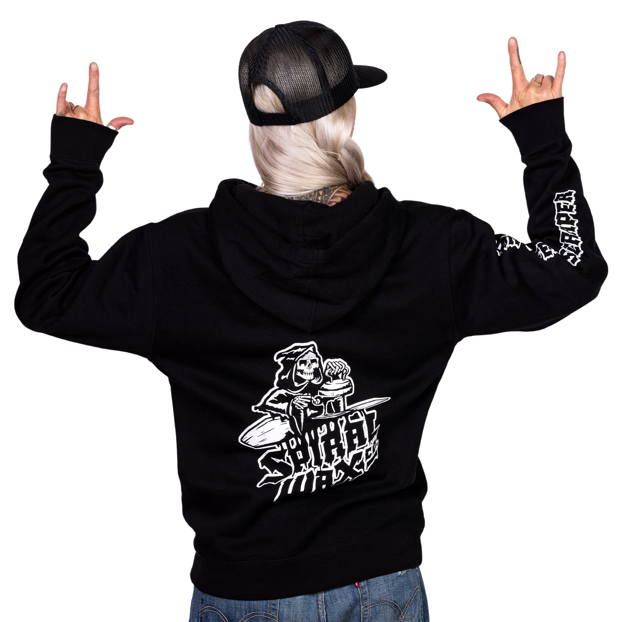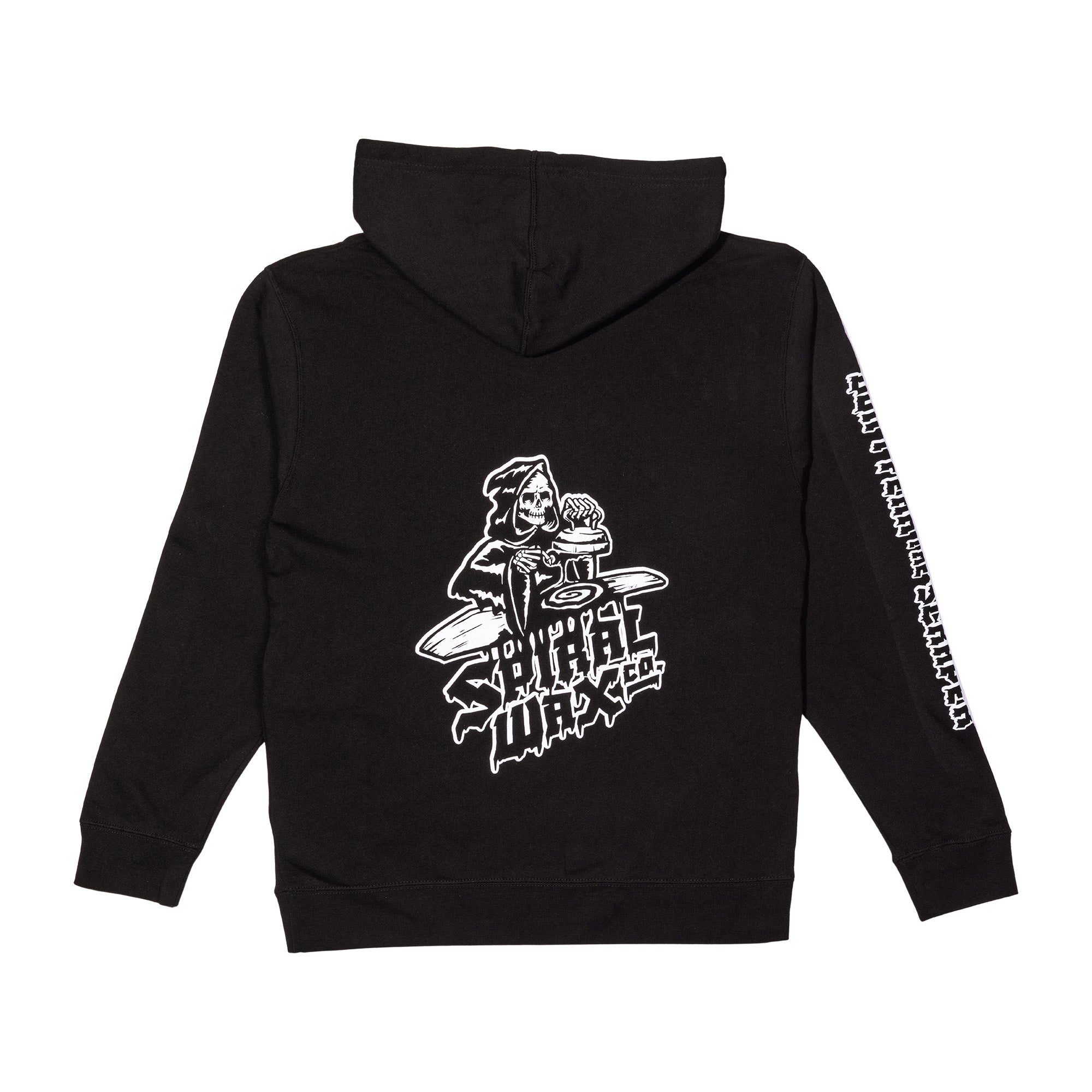 The Grim Reaper’s go-to hoodie for carving evil lines on his coffin.. Artwork by Brian Zager.