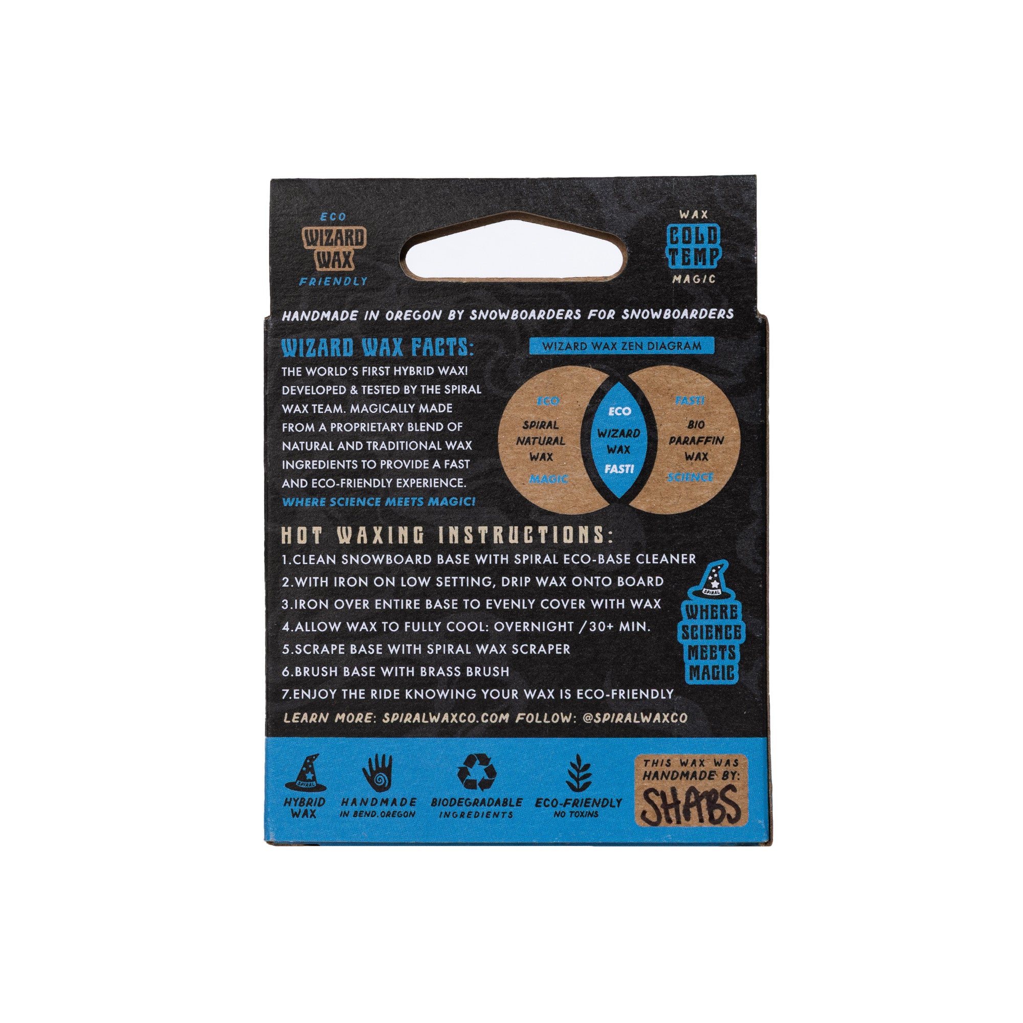 The world's first hybrid snowboard wax! Developed & tested by the spiral wax team. Magically made from a proprietary blend of natural and traditional wax ingredients to provide a fast and Eco-friendly experience. Where science meets magic! Wizard Artwork by: Dave Banks